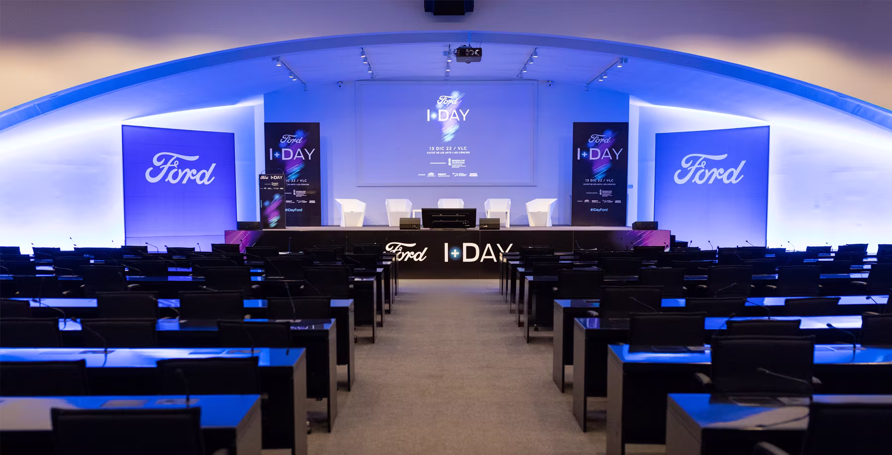 Ford España confió en nuestra agencia para llevar a cabo su primer Ford I+Day en el Museo Príncipe Felipe de la Ciutat de les Arts i les Ciències de València. Desde äbranding, desarrollamos una imagen gráfica innovadora y tecnológica, que integra la silueta de la Comunitat Valenciana.