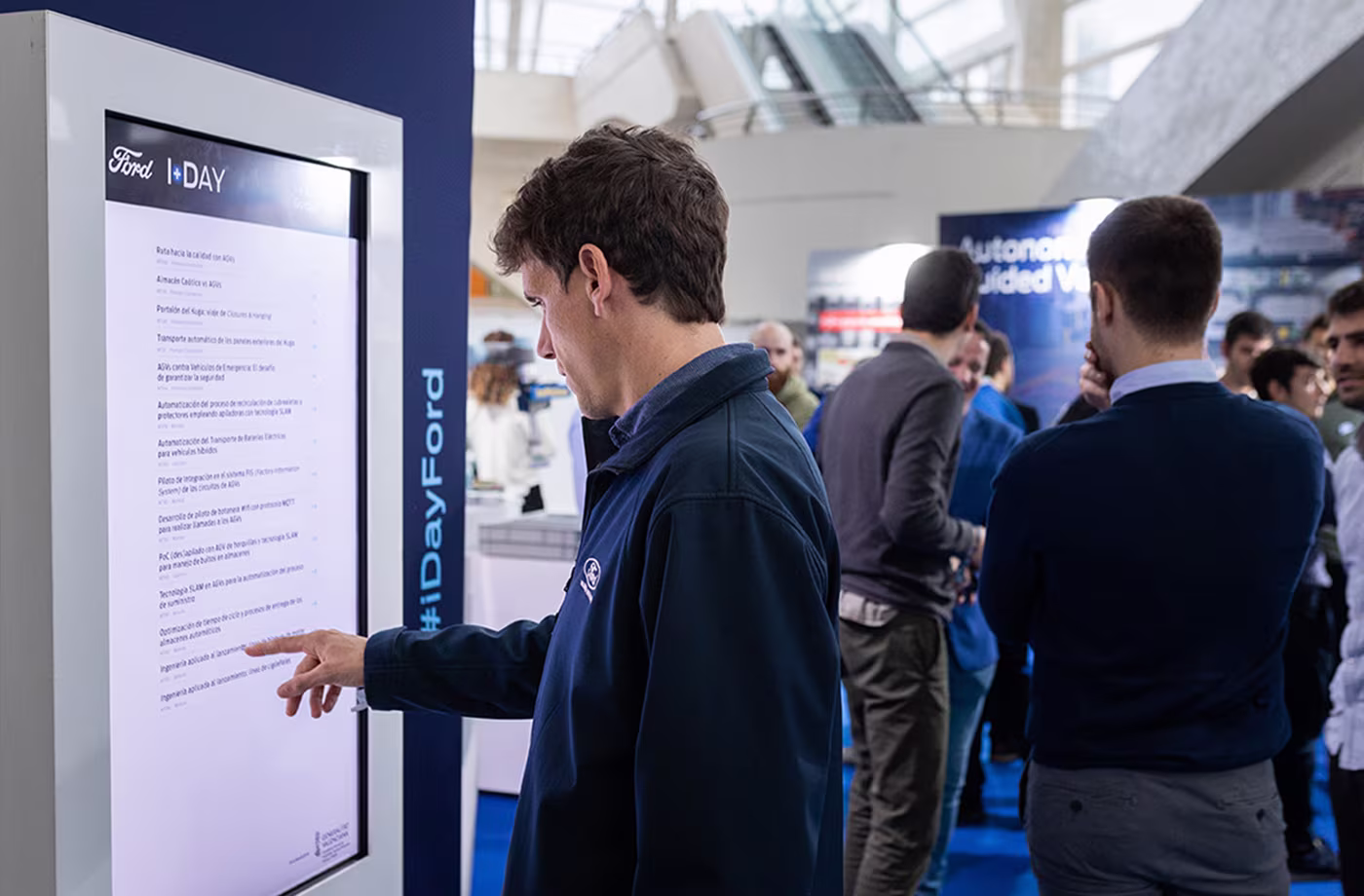 De forma paralela al diseño de todos los soportes gráficos (invitación digital, landing page con inscripción, banderolas, rotulaciones…), se realizó un diseño de distribución para todos los espacios que integraban este evento. Además de un espacio para ponencias, debía incluir una zona de exposición con stands de los diferentes pilares temáticos que estructuran los proyectos de I+D de Ford.