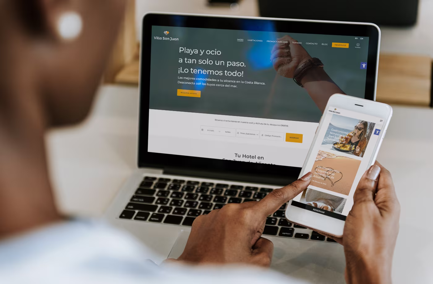 En la web, implementamos un sistema de gestión de reservas para simplificar el proceso de reserva para los clientes. Además, buscamos que la web transmitiera paz y cercanía, ya que se trata de un hotel familiar que tiene, como principal objetivo, hacer sentir a los huéspedes como en casa. Respecto a las campañas en Meta Ads, nuestro objetivo era promocionar el Hotel Villa San Juan a nivel nacional e internacional, asegurándonos de que las paradisíacas playas de Alicante estén siempre presentes en la mente de quienes buscan su próximo destino vacacional.